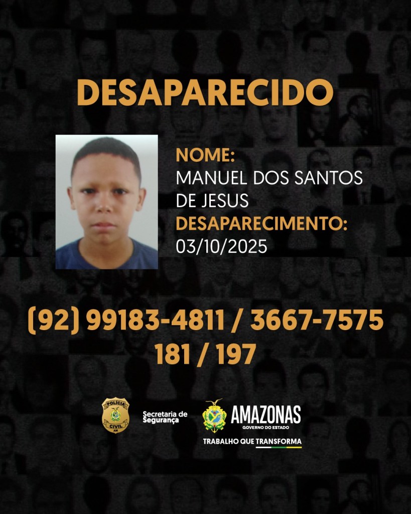 A Polícia Civil do Amazonas divulgou, nesta quinta-feira (30), a imagem de Manuel dos Santos de Jesus, de 11 anos, que está desaparecido desde o dia 3 de outubro em Itacoatiara, a 176 quilômetros de Manaus.